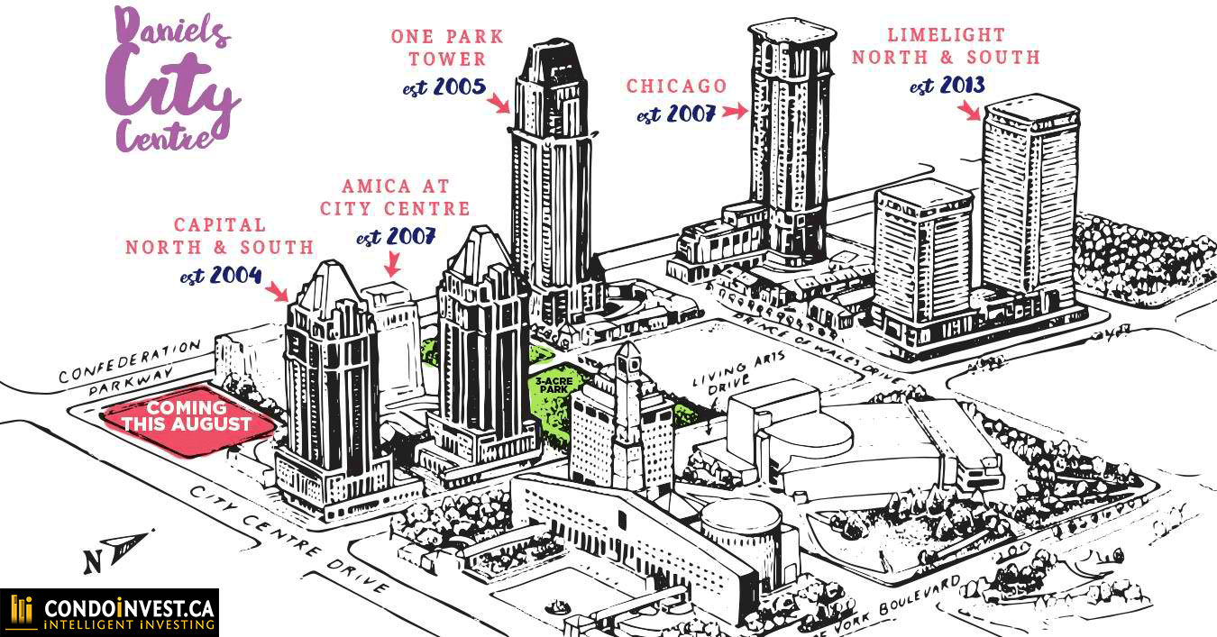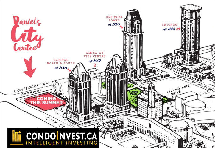 Along Living Arts Drive it is right in Mississauga’s most inspiring and creative street. The development includes a 3-acre community park. Impressively, Daniels City Centre has won multiple awards.